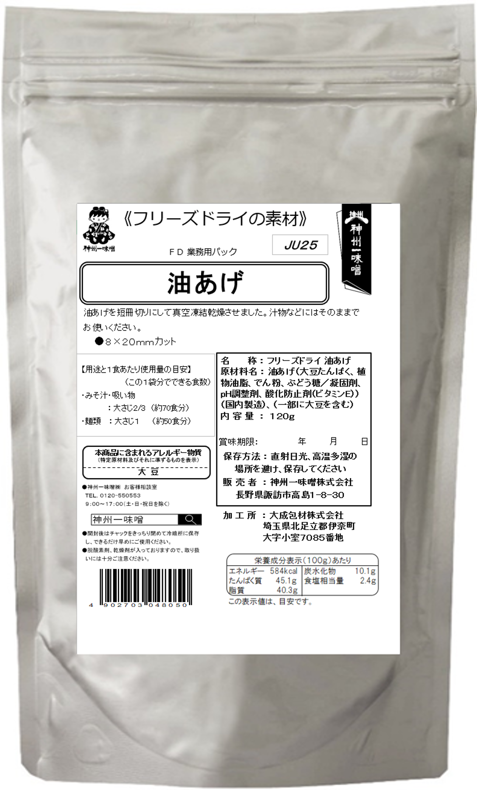 原材料 | 油あげ(大豆たんぱく、植物油脂、でん粉、ぶどう糖/凝固剤、pH調整剤、酸化防止剤(ビタミンE))(国内製造)、(一部に大豆を含む) |
