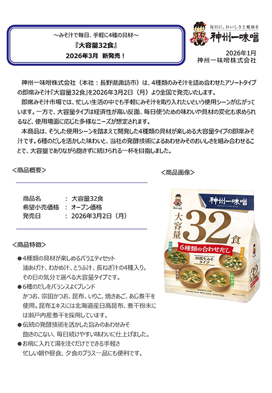 神州一味噌 即席みそ汁『大容量32食』2026年3月 新発売!