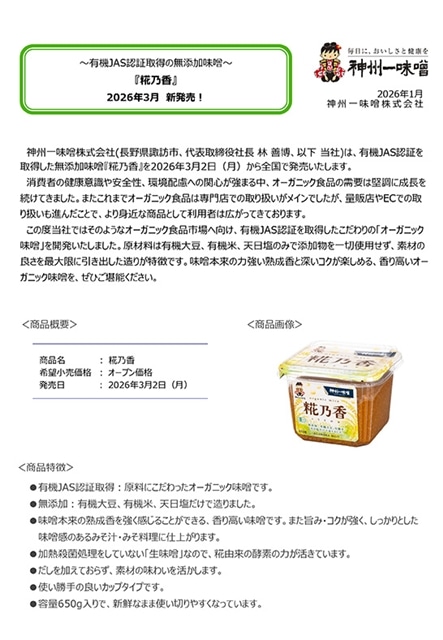 神州一味噌 生味噌『糀乃香』2026年3月 新発売!